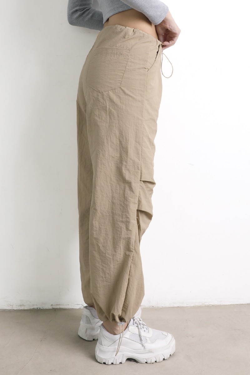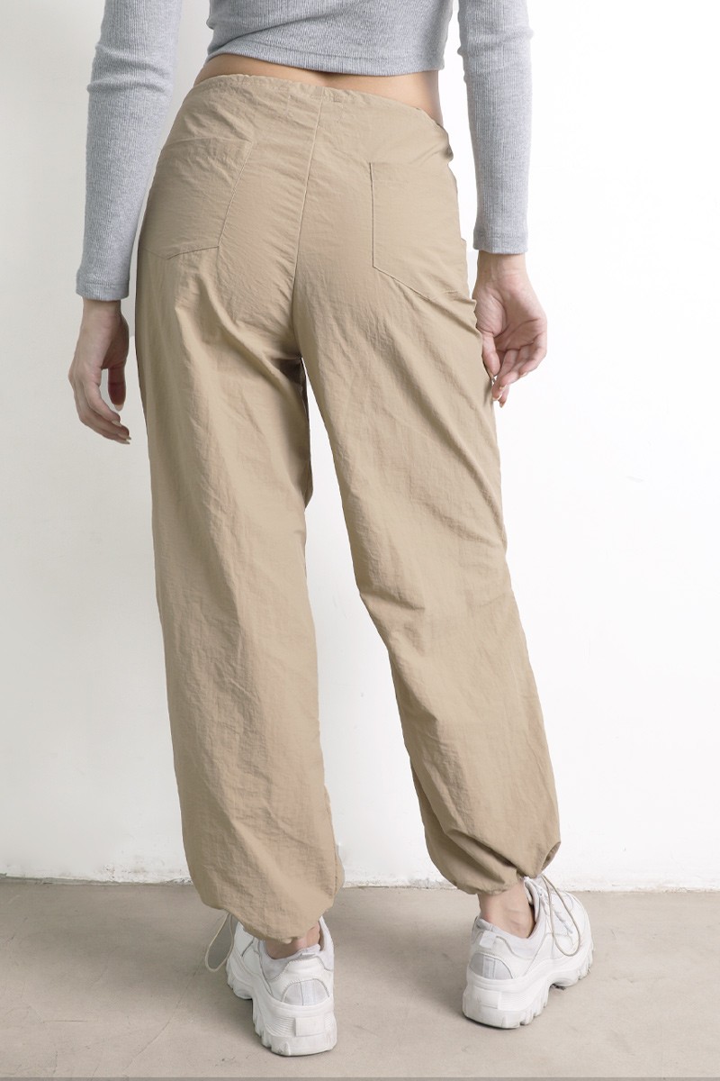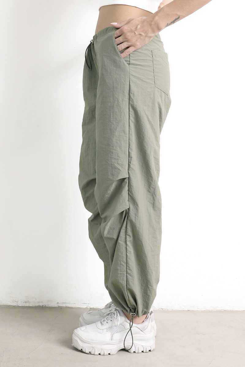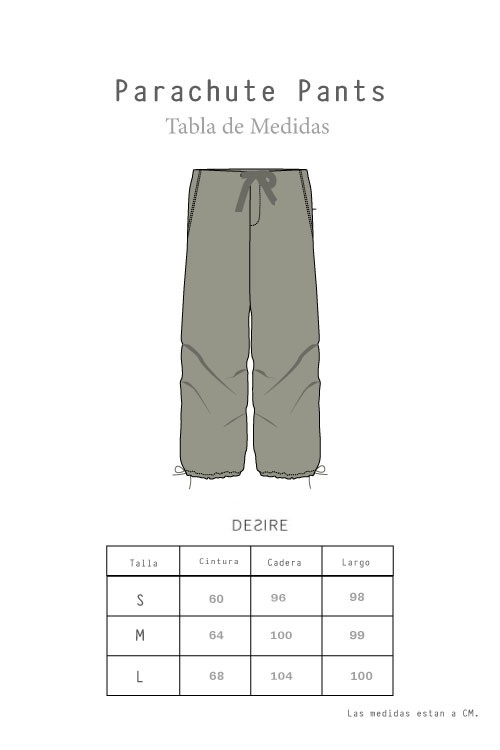 Pantalón parachute , con elástico, y tiras para ajustar en la cintura. Basta regulable con tiras.