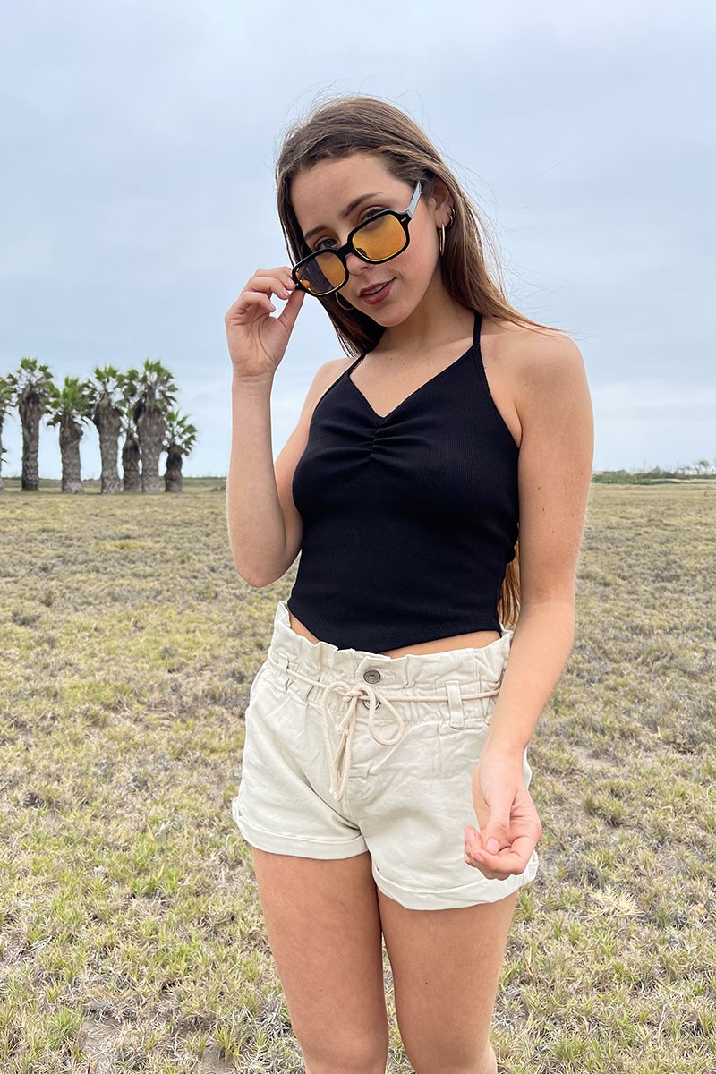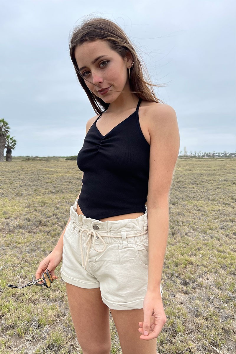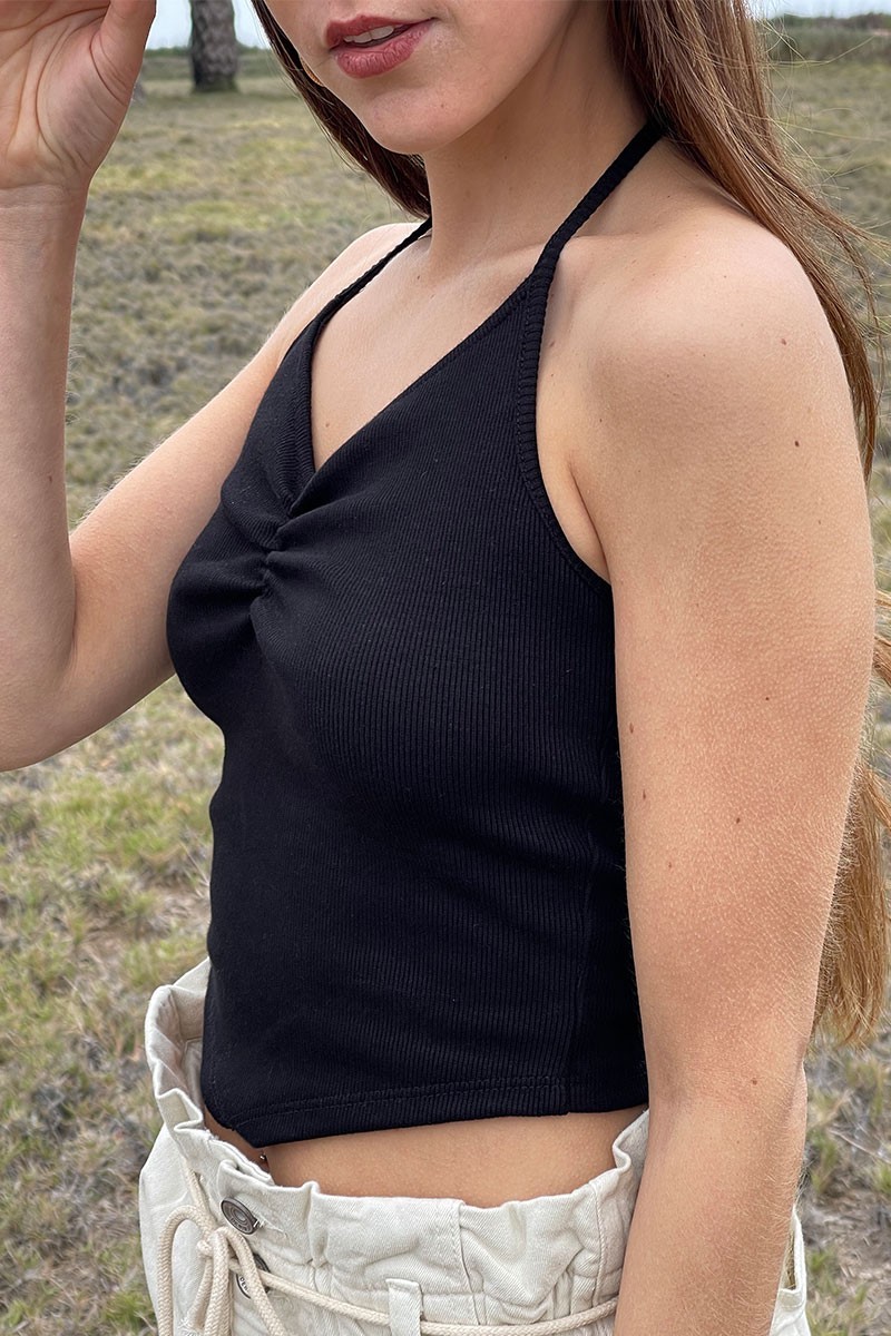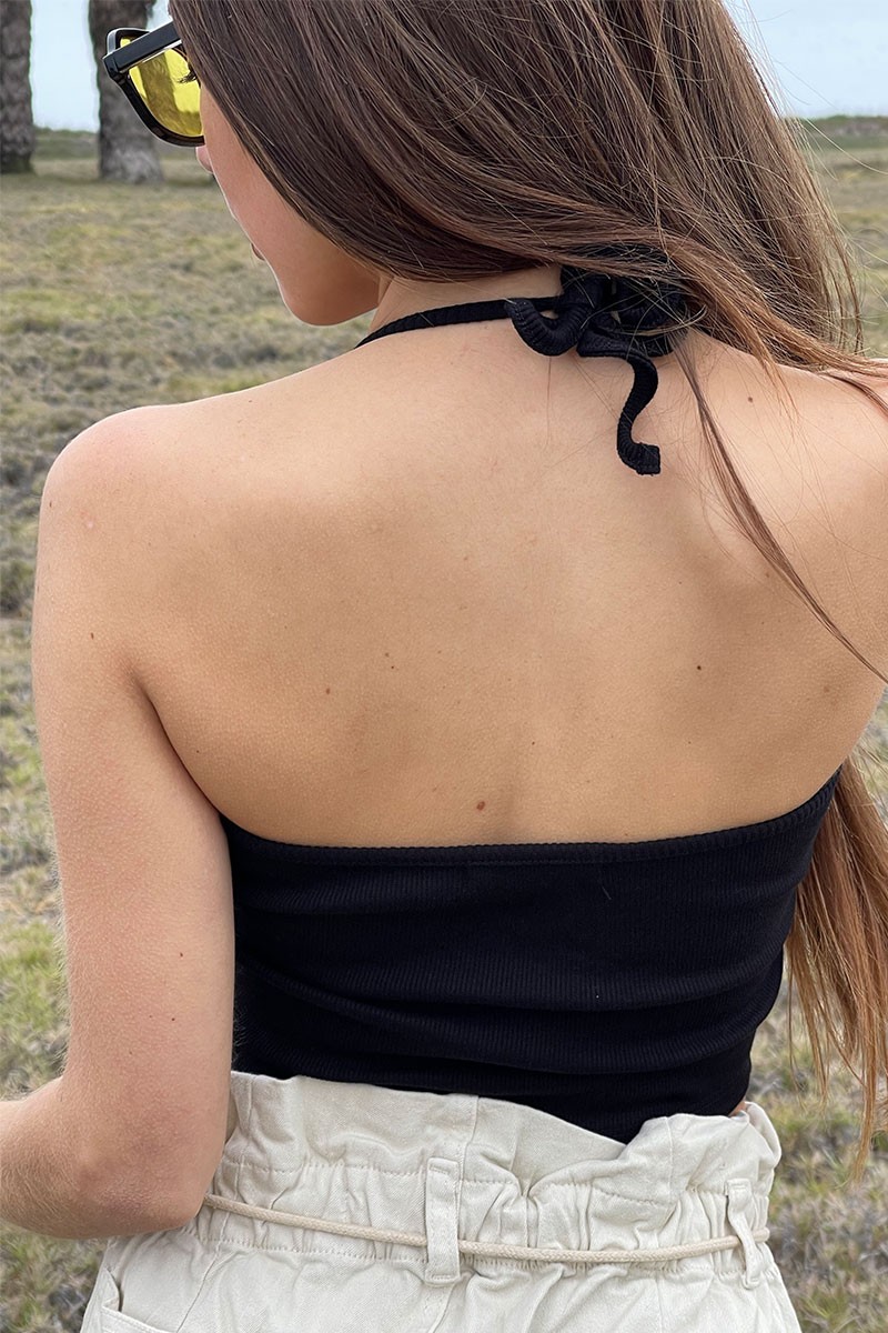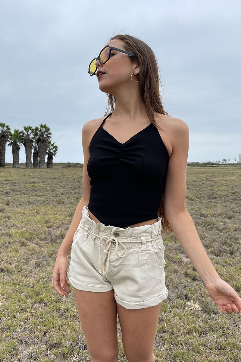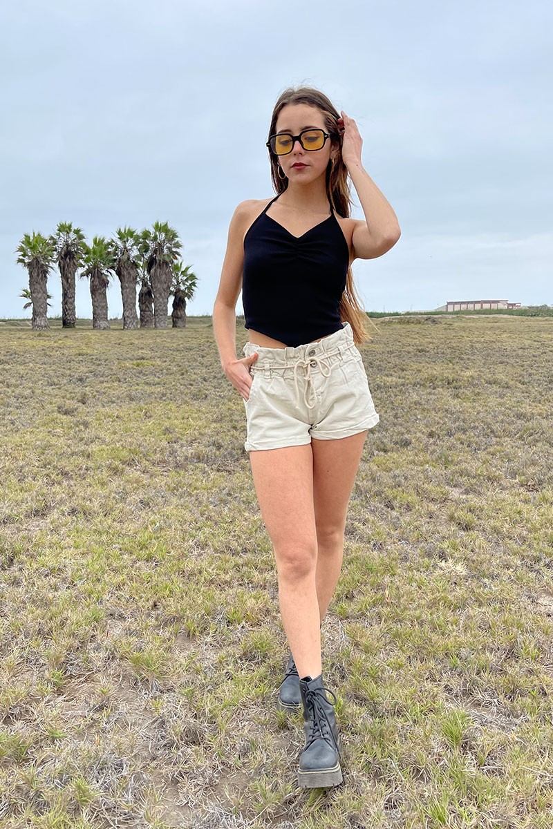 Nuestro Angel Top presenta un diseño halter de tiras que aporta un toque de sofisticación y sensualidad a tu estilo de verano. Estas tiras se cruzan elegantemente en la parte posterior, realzando tu figura y ofreciendo un ajuste personalizable.