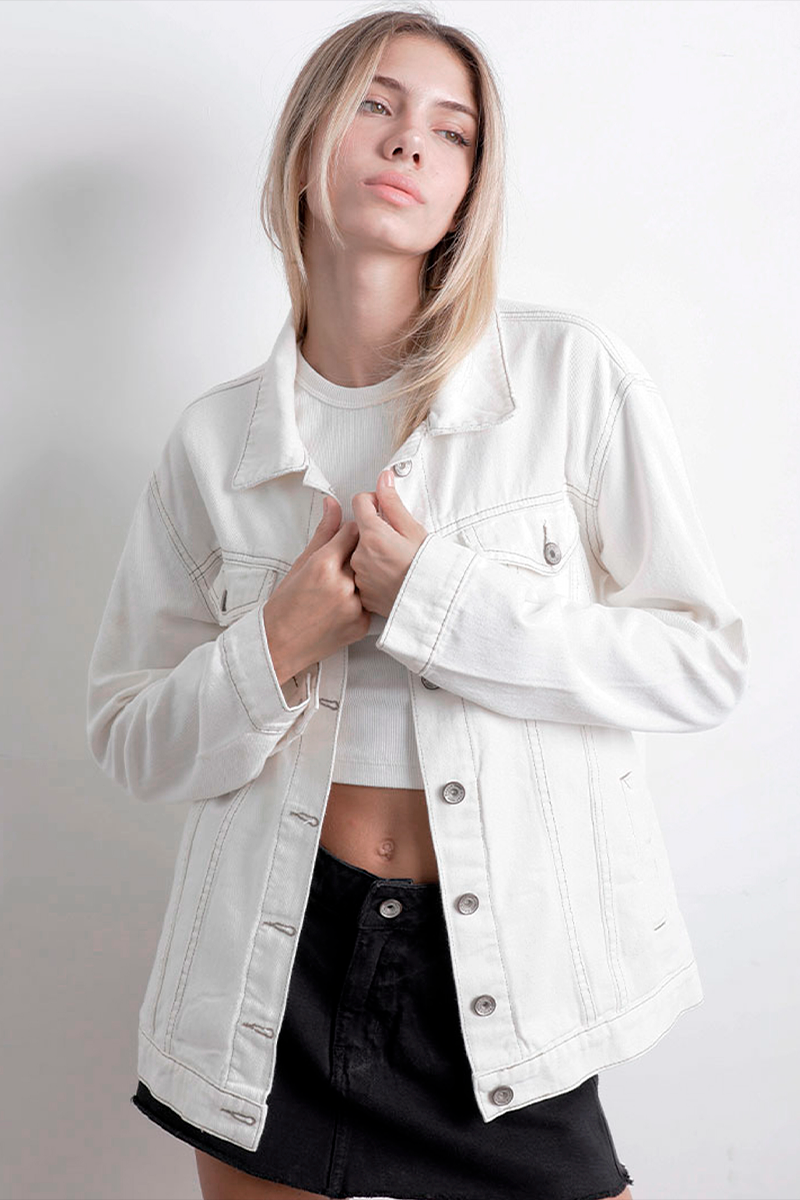 Casaca Denim con bolsillos delanteros y cierre con botones, corte oversized.